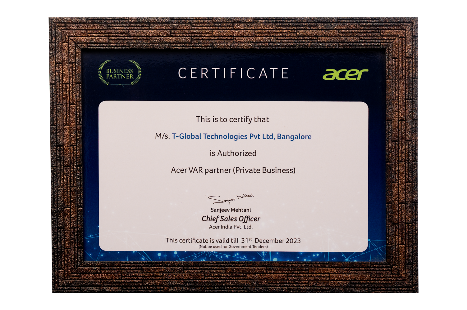 Certified as authorized Acer VAR partner for private business solutions and enterprise sales